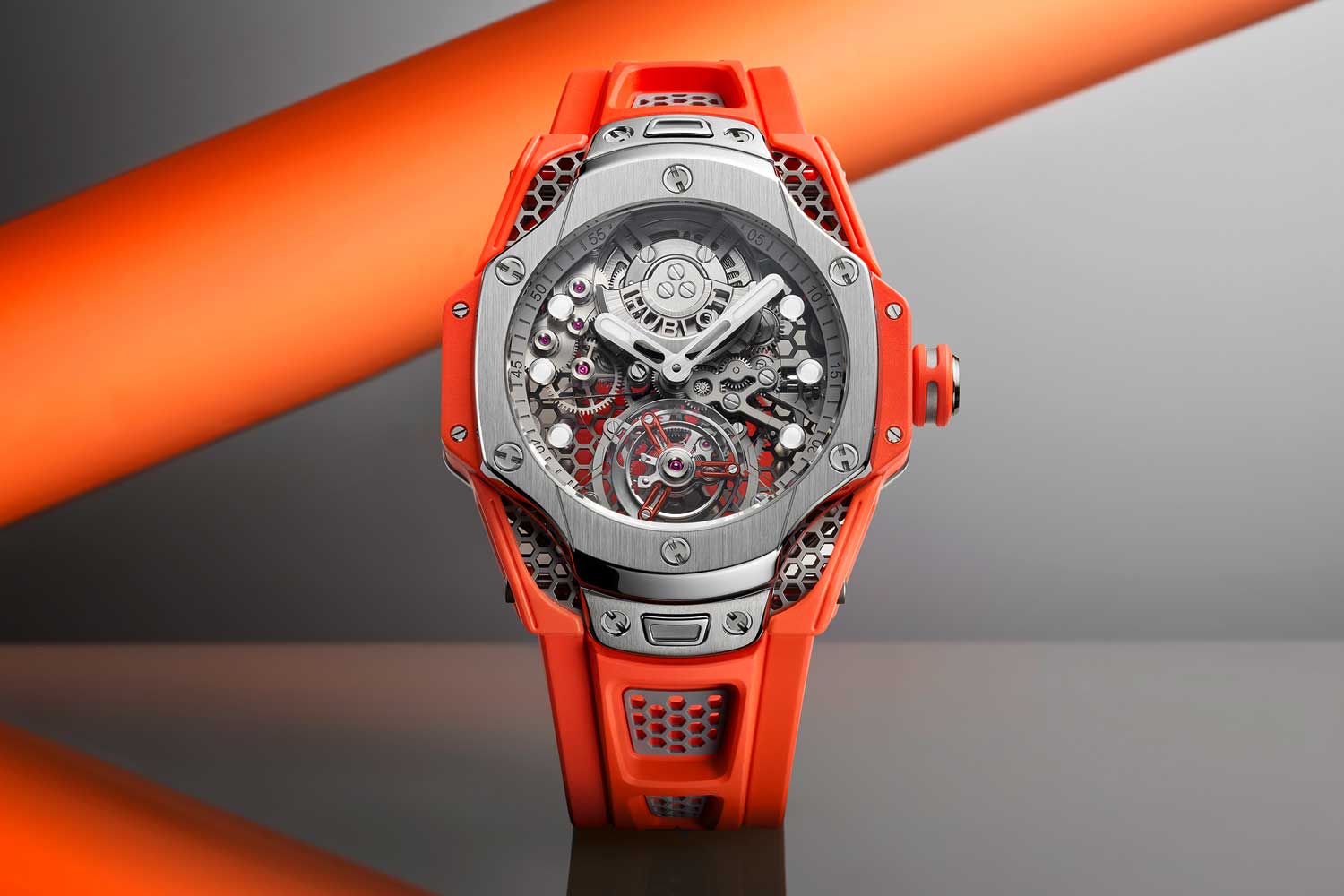 This year, 1:1 replica Hublot introduces a new Big Bang Tourbillon watch designed in collaboration with Ross. The timepiece brings Ross’s experience and artistic perspective and Hublot’s ability to combine unexpected materials together in a watch of polished titanium and smooth orange rubber. It draws inspiration from the mix of steel and granite materials in the 40cm REFORM sculpture, which was created as a tribute to 40 years of perfect fake Hublot.