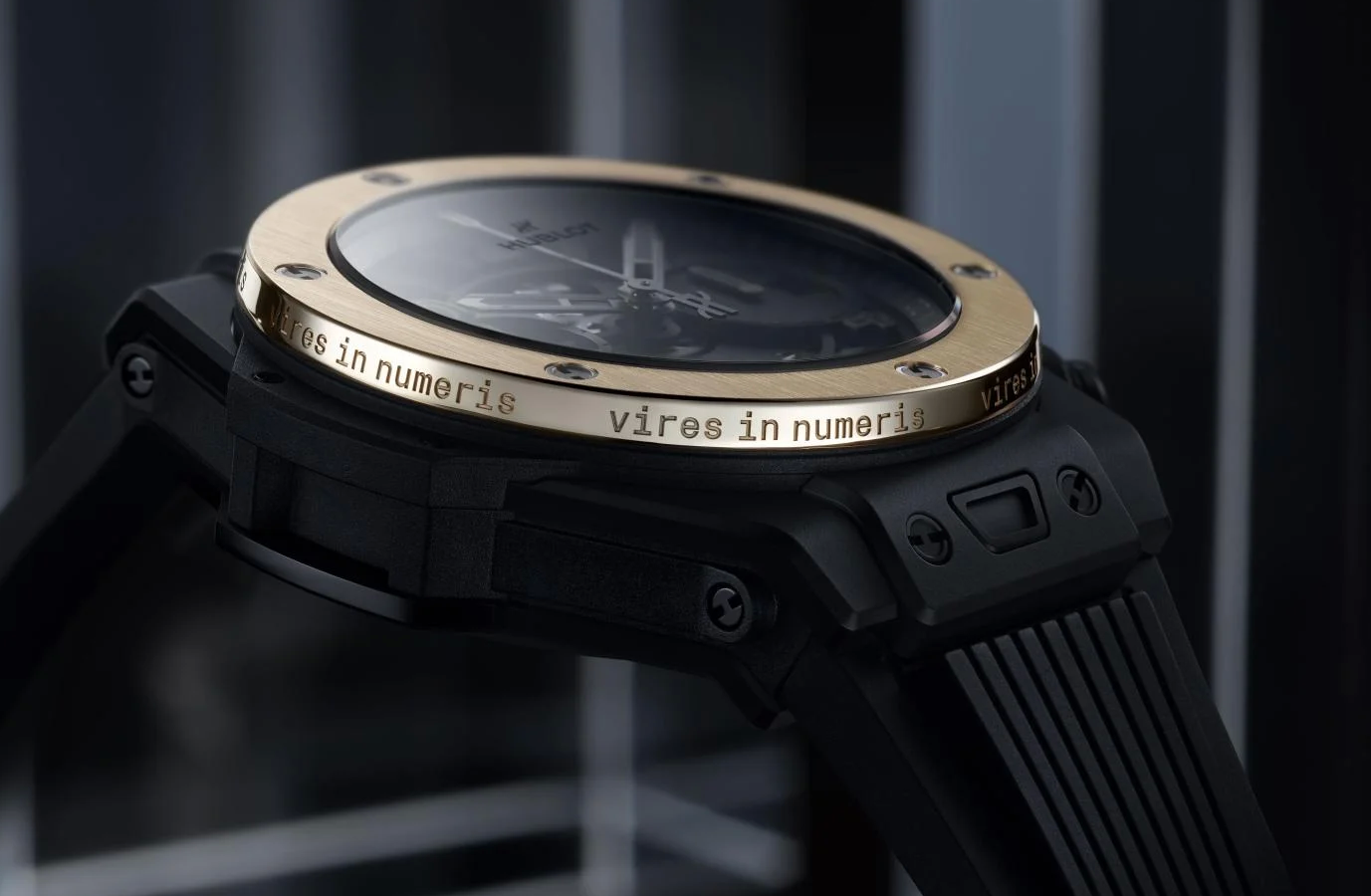 The case shape will look instantly familiar to fans of the Hublot Big Bang replica for men, and the 42mm size should appeal to a wider range of wearers. The main case structure is black ceramic with a golden-hued bezel, and that bezel is the big story of this watch. You see, it’s crafted from a unique alloy known as Electrum, a stainless 50/50 gold and silver blend, which not-so-coincidentally was used in some of the earliest known coins from around 580 BC. It’s a rather pointed touch that cleverly mashes up one of the earliest currencies with the newest. The bezel also seems to have a bit of a lower side profile than other cheap copy Hublot Big Bangs, giving it a coin-like appearance. Along that coin edge, the Latin phrase “Vires in Numeris” is stamped six times, a tip of the hat to Bitcoin’s credo, translating to “strength in numbers”. This is just one of the ways old collides with new in this release.