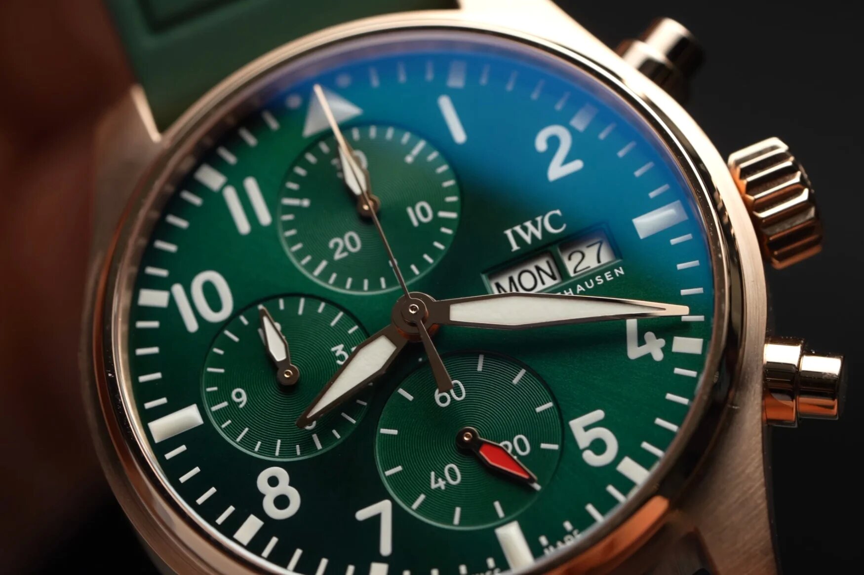 Though cased in solid gold, it’s the sunburst finish of the green dial, along with its azurage brushed sub-registers, that are the more striking. With white lume throughout, with the exception of the running seconds at 6 o’clock in red, the green isn’t overly loud, as it mostly takes on deep emerald tones. The gold-plated sword handset matches the case in material, while still offering decent legibility. Finally, the dial is kept balanced by the white day and date wheels at three o’clock, separating the 1:1 fake IWC logo and the denomination of the brand’s Schaffhausen headquarters.